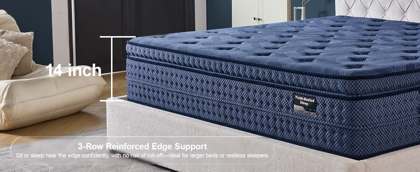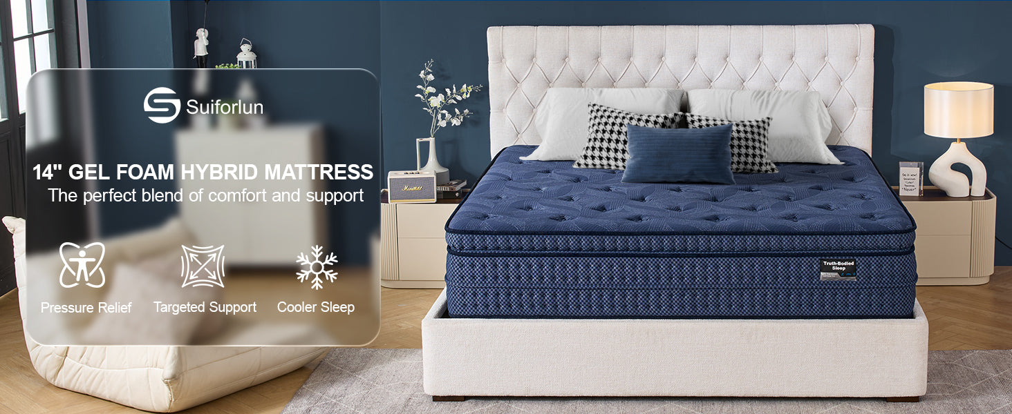 The Suiforlun SolidEase 14 Inch Hybrid Mattress blends plush comfort with lasting stability. Featuring a Euro top layer infused with cooling gel memory foam, this mattress cradles your body while promoting airflow for sweat-free sleep. Beneath, individually wrapped 7-zone pocket springs deliver precise support—firmer under hips and waist, softer under shoulders and legs—for better spinal alignment and reduced pressure points. Reinforced foam edges extend durability and maximize usable space, so you can sit or sleep comfortably across the mattress. Safe, eco-conscious, and backed by a 120-night trial and 10-year support, SolidEase ensures deep, restorative rest every night.